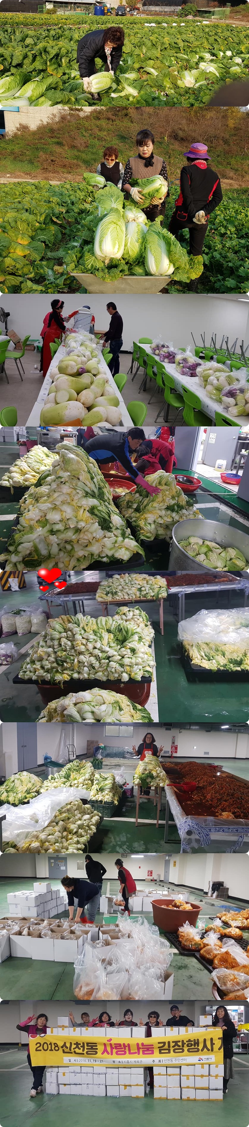 11월에는" 신청동 사랑나눔 김장행사"를 진행하여 반찬 나눔봉사 독거어르신, 신천자원봉사자 등과 함께 김장을 했습니다. 김장한 김치는 신천동 관내 저소득층, 독거어르신 등 총 20여가정의 어르신에게 전달하였습니다.