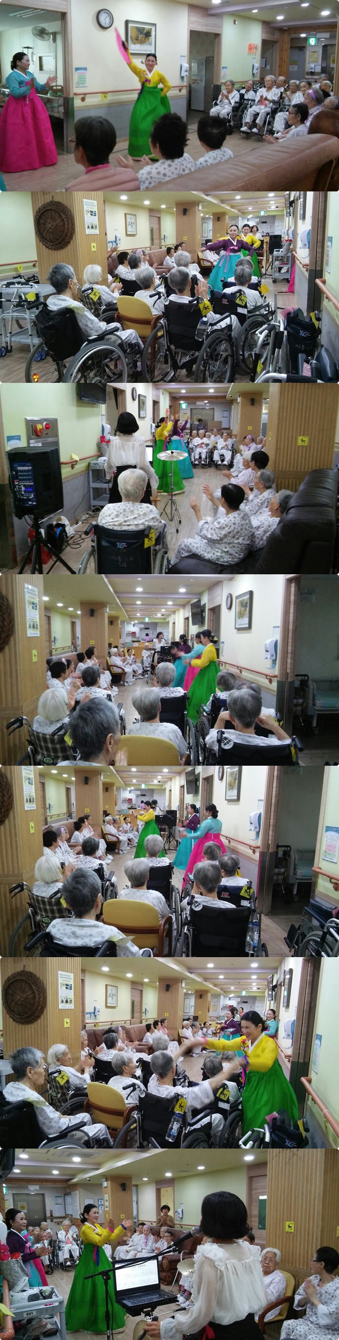 6월 , 예쁜날들 무용단에서 본원을 방문하여 환자분들에게 전통 민요와 노래, 트로트 노래메들리 등 멋진 공연을 보여주셨습니다. 트로트를 부르는 공연팀과 함께 환자분들께서 춤추고, 흥겹게 노래를 따라 부르시는 모습을 볼 수 있었습니다.
