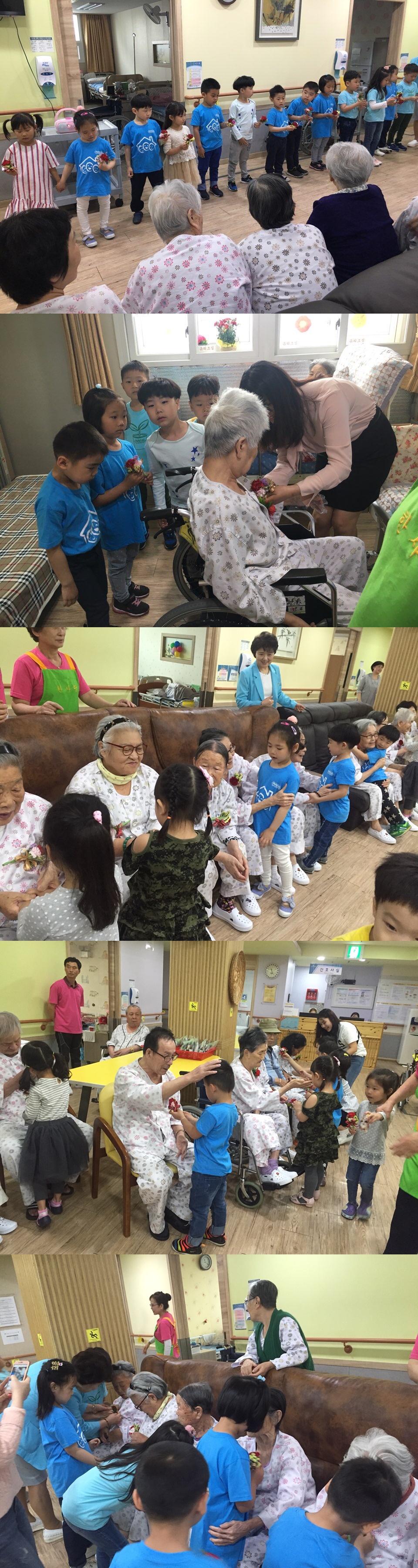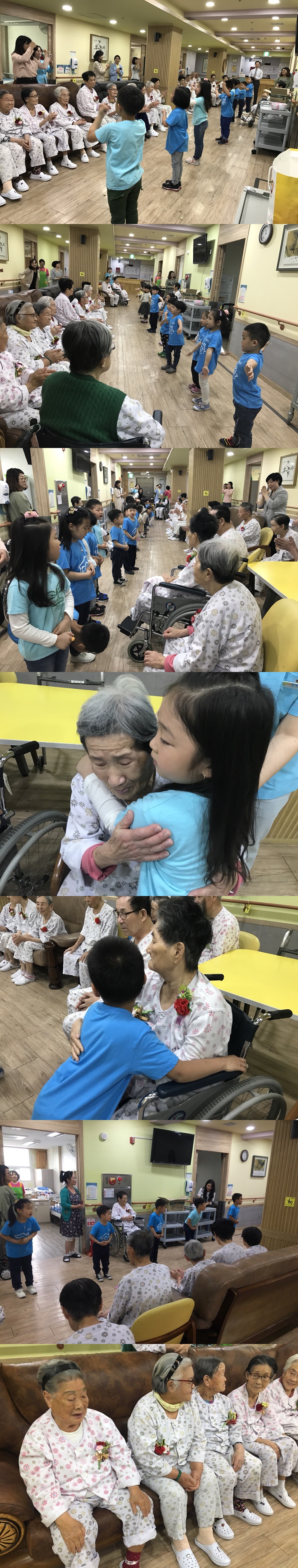 사전에 준비해온 카네이션 꽃을 서툴지만 환자분들 한분한분의 가슴에 달아드렸으며 환자분들 역시 우리 “손녀, 손자가 달아준 것 같다”며 너무나 기뻐하시는 모습을 볼 수 있었습니다. 또한 카네이션을 달아드리고 5~6세 반과 7세반 두팀이 나뉘어 준비한 노래 2곡에 맞춰 율동을 선보이면서 환자분들에게 큰 기쁨과 즐거움을 선사하였습니다.