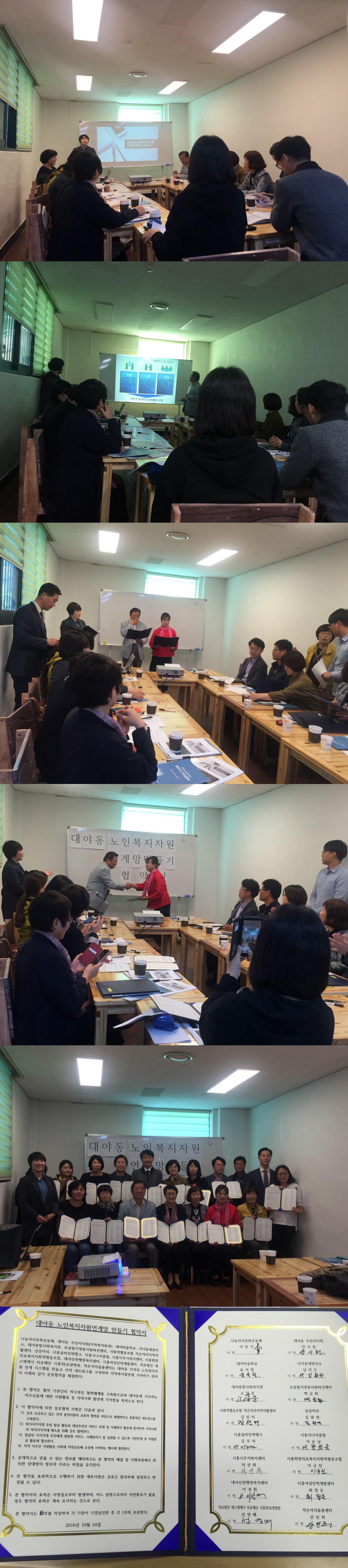 2016년 10월24일 시흥시 다다커뮤니센터에서 진행된 '대야동 노인복지자원 연계 시스템만들기' 주제로 대야동 소재 복지 관련 기관 및 단체의 MOU 협약 체결이 진행되었습니다.