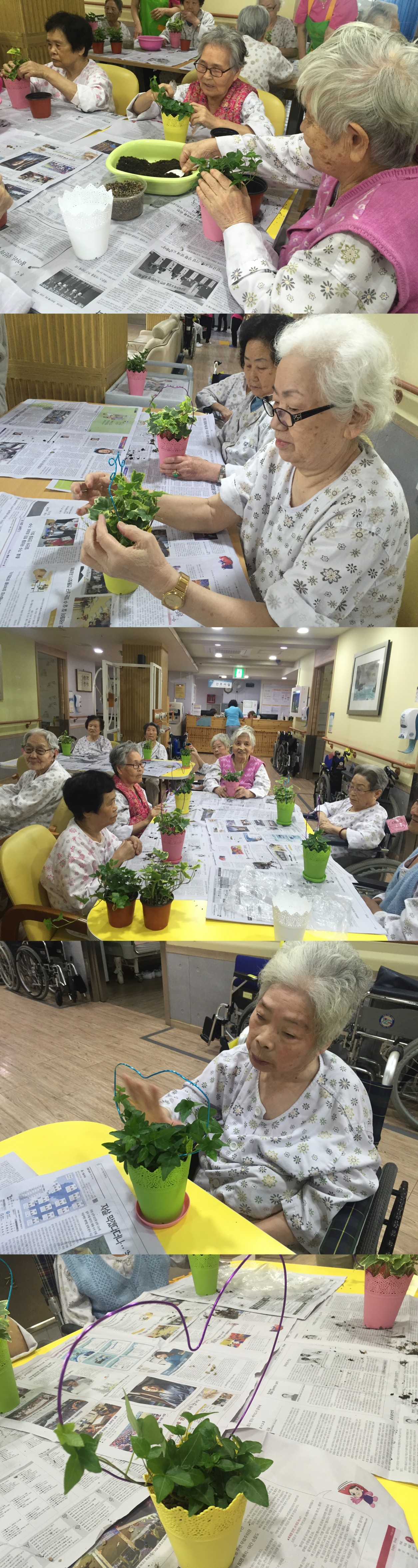 참여 환자분들께서 많은 관심을 보이셨으며 함께 화분에 흙고 돌멩이를 넣고 덩굴식물을 옮겨 심는 시간을 가졌으며 마지막으로 디자인 와이어를 이용하여 참여 환자분들 개인 취향에 맞게 꾸며 마무리를 지었습니다.