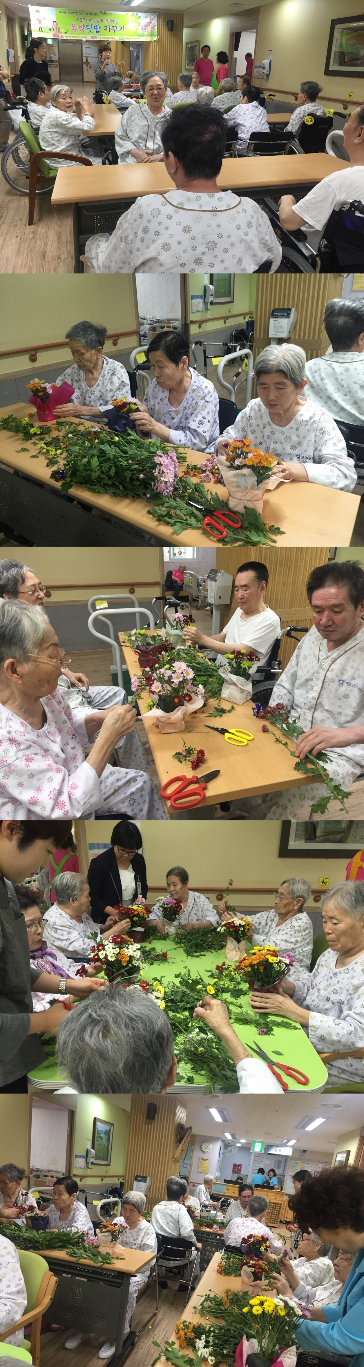 시흥SK요양병원에서는 시흥시 생명농업기술센터의 지원을 받아 원예치료 프로그램을 진행하고 있습니다. 9월 9회기 원예치료 시간에는 환자분들과 ‘향기로운 국화 꽃꽃이’ 주제로 씨향기로운 국화꽃들을 이용하여 함께 꽃꽂이를 해보는 시간을 가졌습니다.