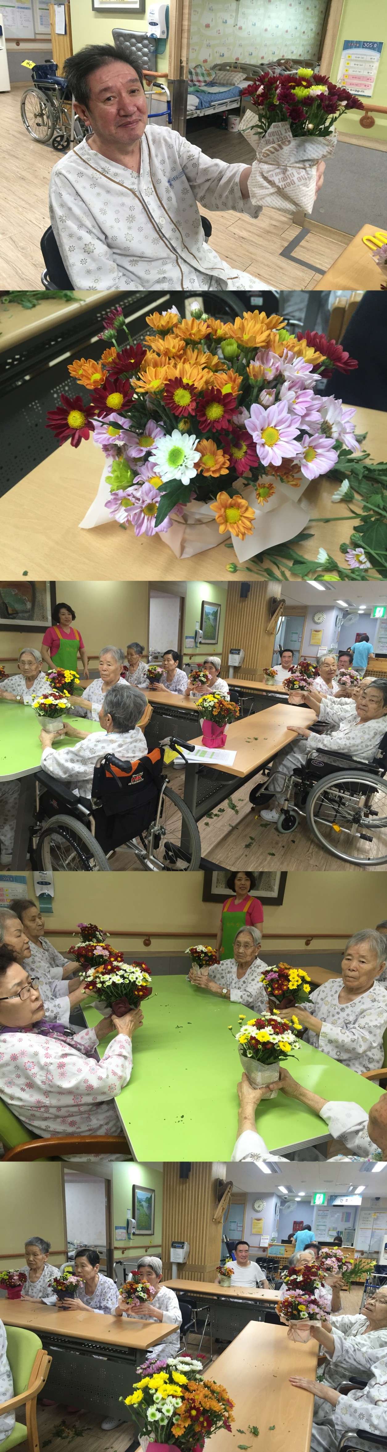 3층 병동 참여 환자분들에게 색깔별 소국, 리본, 꽃가위, 종이상자를 이용하여 향기로운 국화 꽃꽂이를 이어나갔으며 환자분들께서 직접 참여하시면서 너무나 좋아하시는 모습을 볼 수 있었습니다.