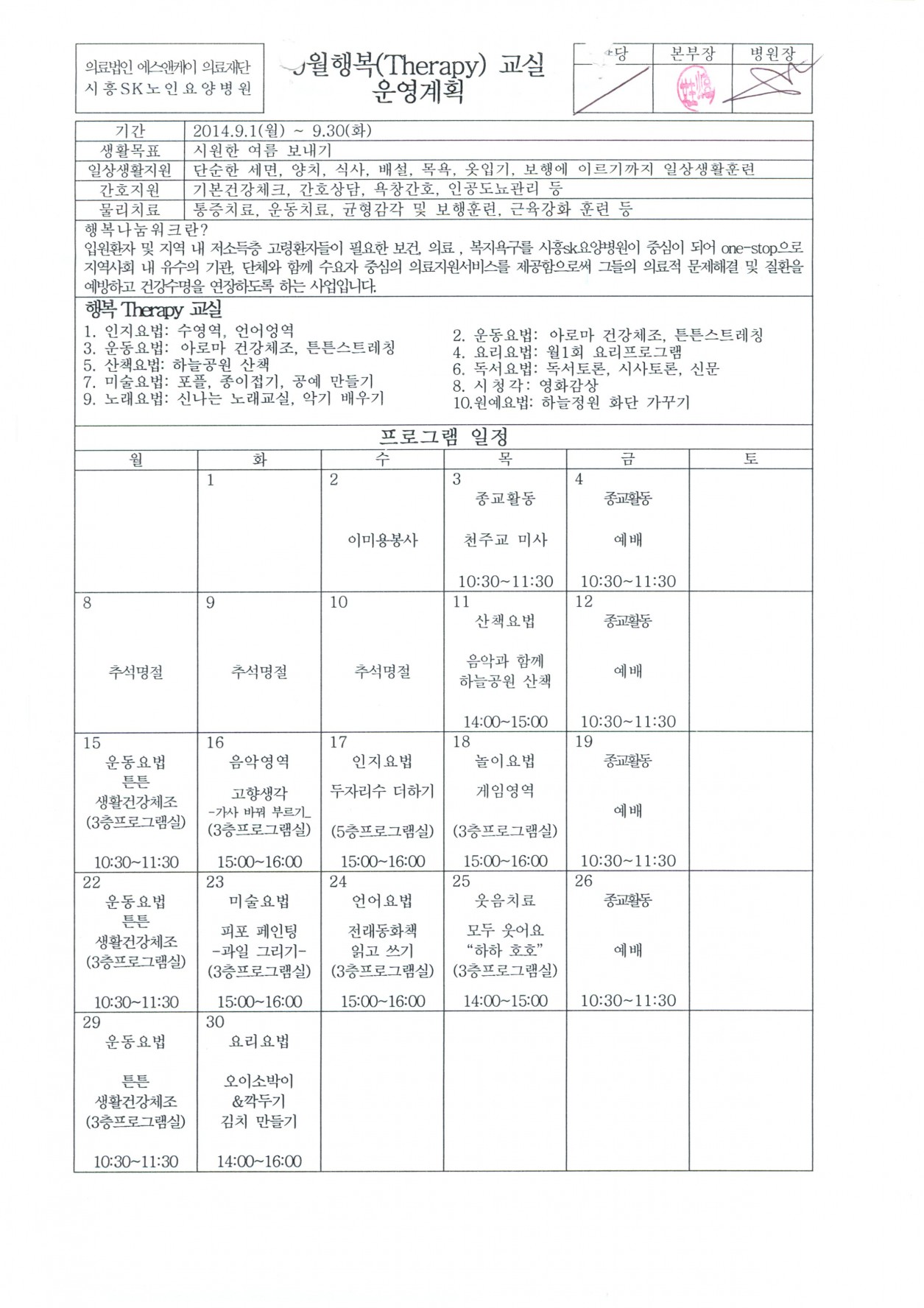 신체,인지기능 향상을 위한 9월 행복테라피 운영계획 입니다.