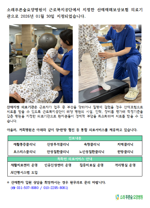 저희 소래푸른숲요양병원이 근로복지공단에서 지정한 산재재해보상보험 의료기관으로 선정되었습니다.