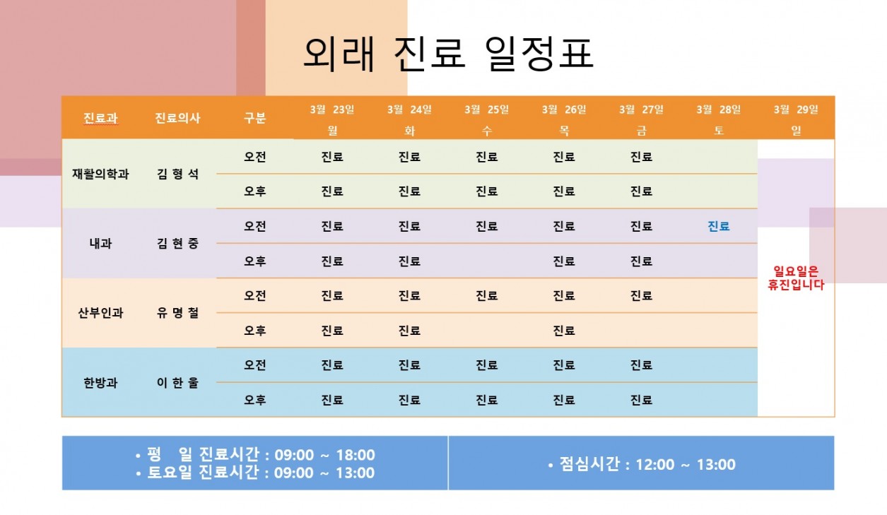 2026년 3월 4째주 외래 진료 일정표 페이지 정보 작성자 소래푸른숲요양병원 댓글 0건 조회 49회 작성일 26-03-23 11:03 본문 . 목록 다음글2026년 3월 2째주 외래 진료 일정표 26.03.11