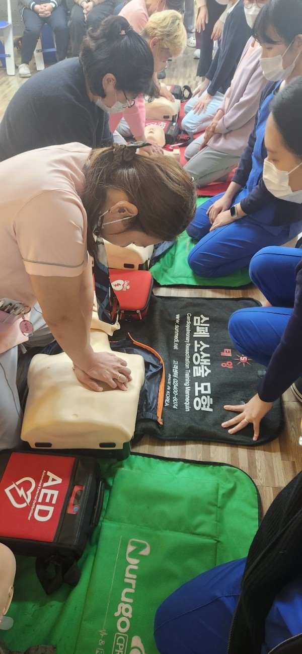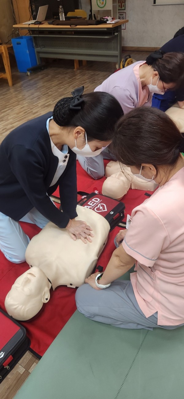 사진에는 나와계시지 않지만 심폐소생술 전문 강사분을 초빙하여 직원들에게 심폐소생술 교육을 강의해주시고 실습까지 진행을 했던 귀중한 시간이었습니다 !