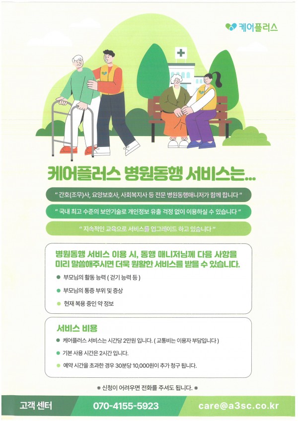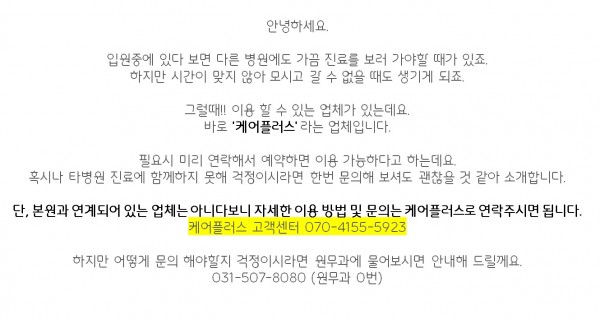 병원동행 업체 안내 - 케어플러스 페이지 정보 작성자 소래푸른숲요양병원 댓글 0건 조회 86회 작성일 25-12-23 10:43 본문 . 목록 이전글2026년 병오년 새해 환자분의 시 올려드립니다. 26.01.05 다음글환자 만족도 향상을 위해 타병원에 다녀왔습니다. 25.12.17
