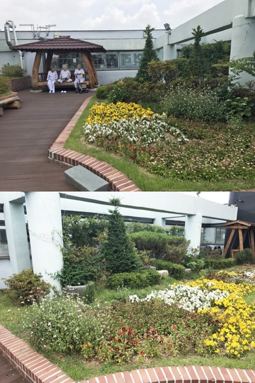 6월의 하늘 정원 모습입니다. 우리 환자분들께서도 점심식사를 하신 후 정원에서 산책을 하고 계십니다.