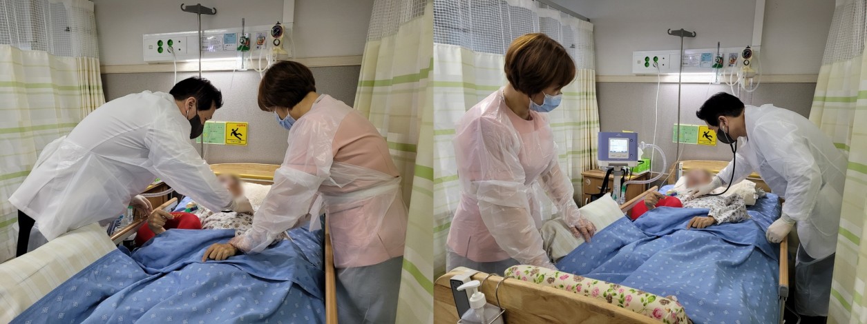 병동 간호사와 함께 병동을 돌며 환자분들의 불편한 곳을 체크하고 계십니다.