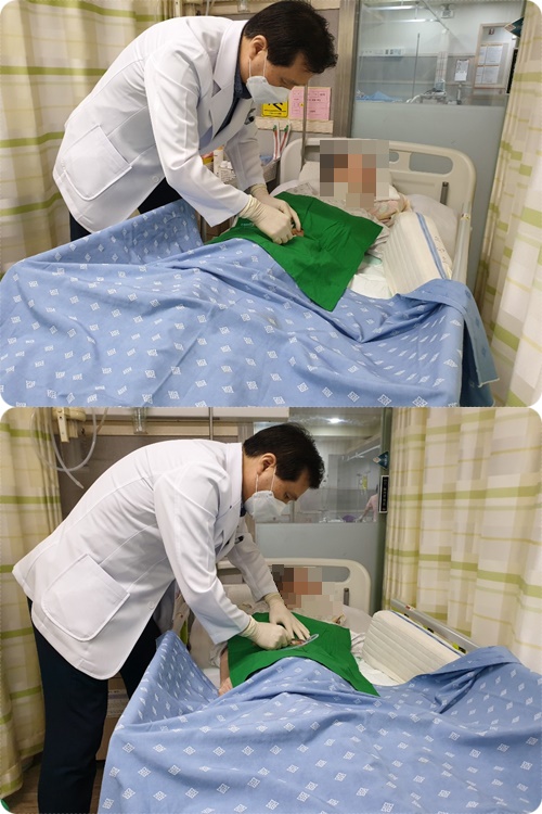 병동 간호사와 함께 병동을 돌며 환자분들의 불편한 곳을 체크하고 계십니다.