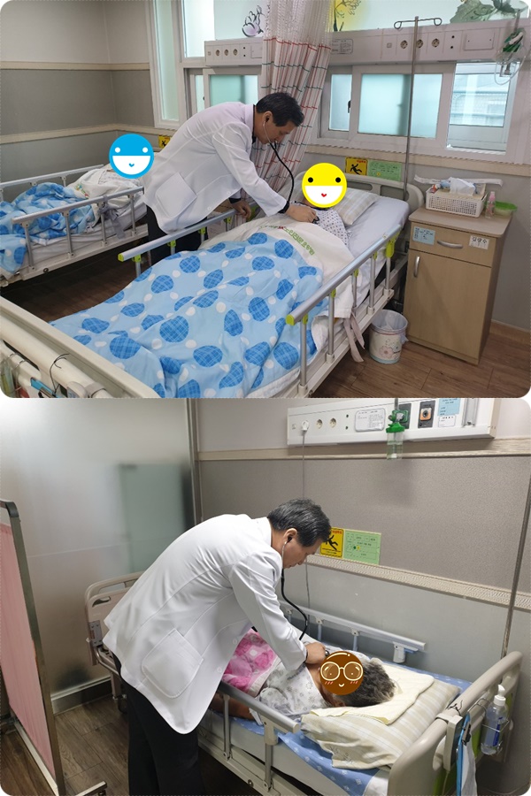 병동 간호사와 함께 병동을 돌며 환자분들의 불편한 곳을 체크하고 계십니다.