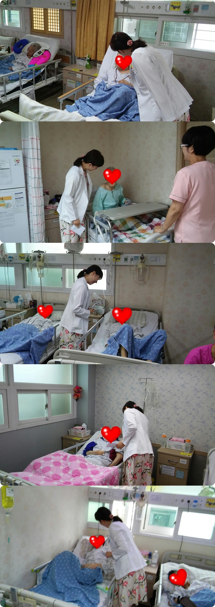 간호사와 함께 병동 회진을 하며 환자의 건강상태,수면상태 등 작은것 하나하나 확인하고 체크하면 환자분들의 상태를 확인하고 계시는 모습입니다.