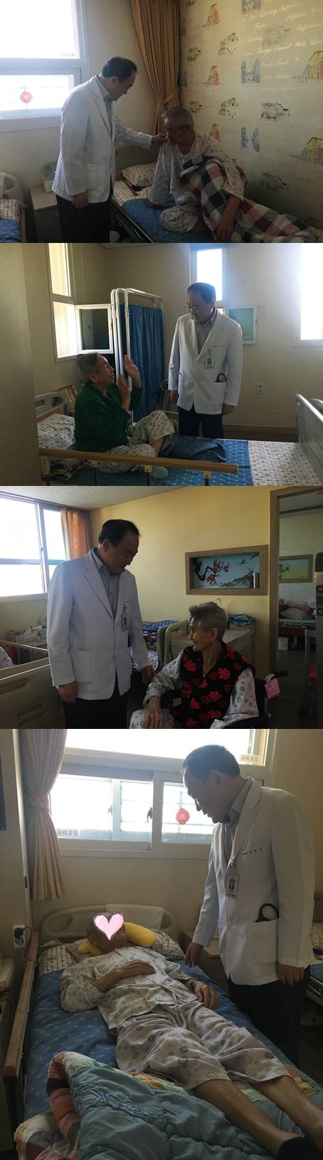 환자의 불편한 곳을 체크하시며, 회진 중이십니다.
