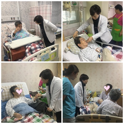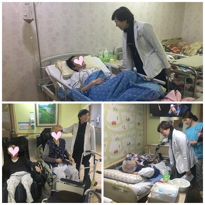 환자분들의 건강상태를 체크하고 환자분에게 격려의 말을 해주고 계십니다.