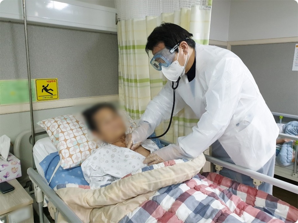 병동 간호사와 함께 병동을 돌며 환자분들의 불편한 곳을 체크하고 계십니다.