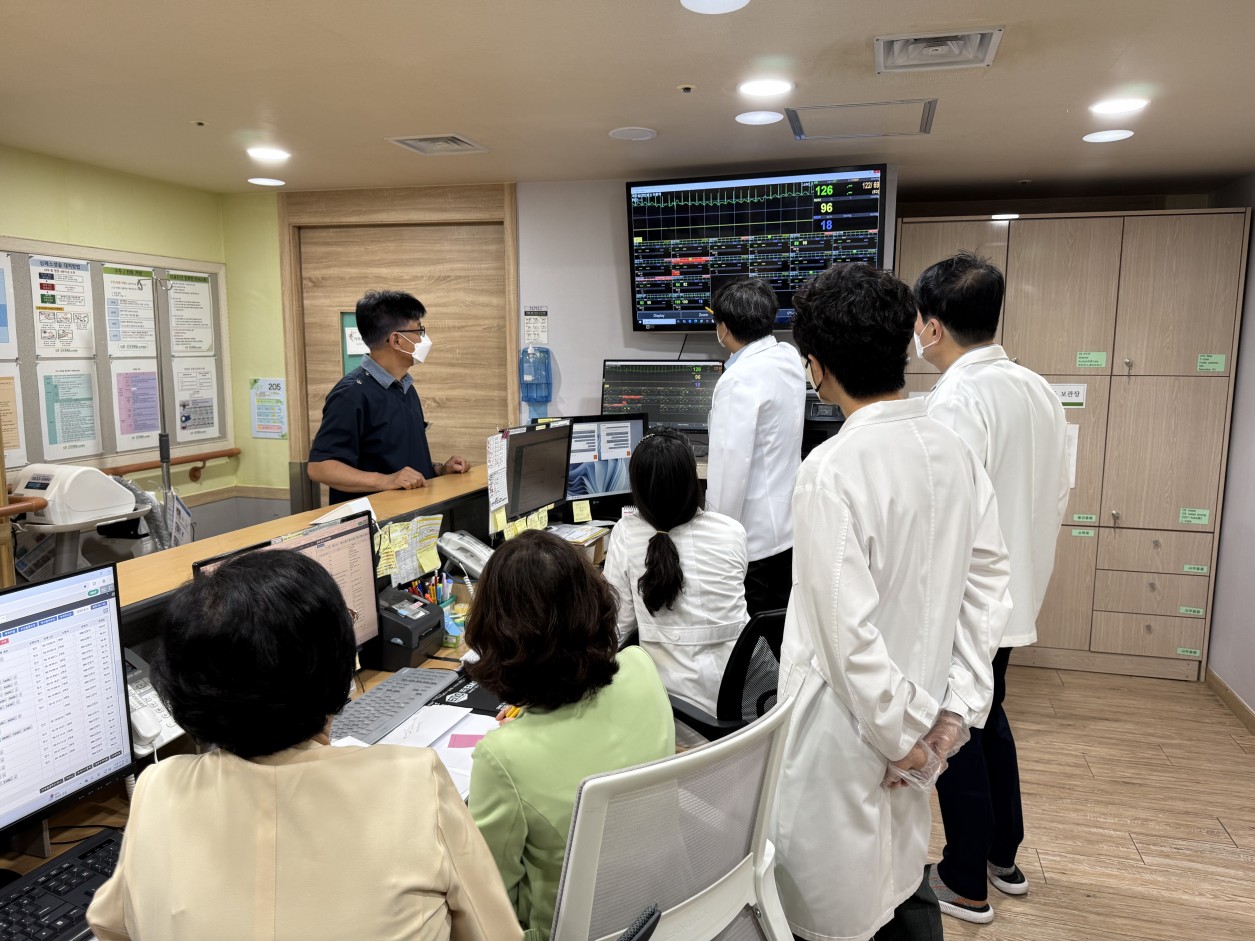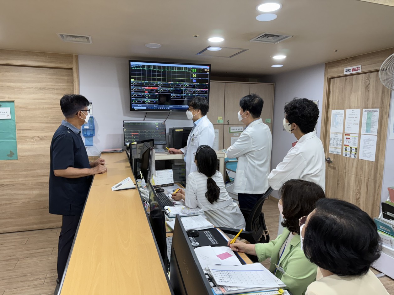 병원장님께서 각 의료진과 간호부장님과 함께 심장박동 모니터를 이용하여 중한 환자분들에 대한 진료회의를 진행하시는 모습 입니다 !