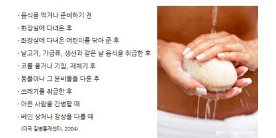최근 몇 년 사이 등장해 전 세계를 공포에 휩싸이게 한 것들이 있으니 바로 각종 전염성 질병들이다. 조류독감, 중증급성호흡기증후군(사스)에 이어 A형 간염, 신종플루까지 이름만으로도 두려운 질병 외에도 식중독, 세균성 이질, 콜레라와 유행성 눈병 등 각종 전염성 질병까지 인간은 늘 위험에 노출돼 있다. 여기서 아이러니한 것 한 가지. 이런 무시무시한 각종 감염성 질병으로부터 자신의 건강을 보호하는 아주 쉽고도 간단한 방법이 있으니 그것이 바로 손 씻기이다.최근 몇 년 사이 등장해 전 세계를 공포에 휩싸이게 한 것들이 있으니 바로 각종 전염성 질병들이다. 조류독감, 중증급성호흡기증후군(사스)에 이어 A형 간염, 신종플루까지 이름만으로도 두려운 질병 외에도 식중독, 세균성 이질, 콜레라와 유행성 눈병 등 각종 전염성 질병까지 인간은 늘 위험에 노출돼 있다. 여기서 아이러니한 것 한 가지. 이런 무시무시한 각종 감염성 질병으로부터 자신의 건강을 보호하는 아주 쉽고도 간단한 방법이 있으니 그것이 바로 손 씻기이다.