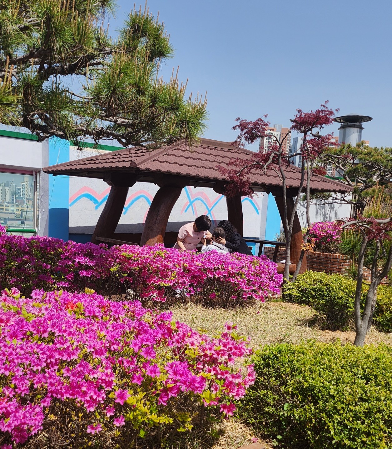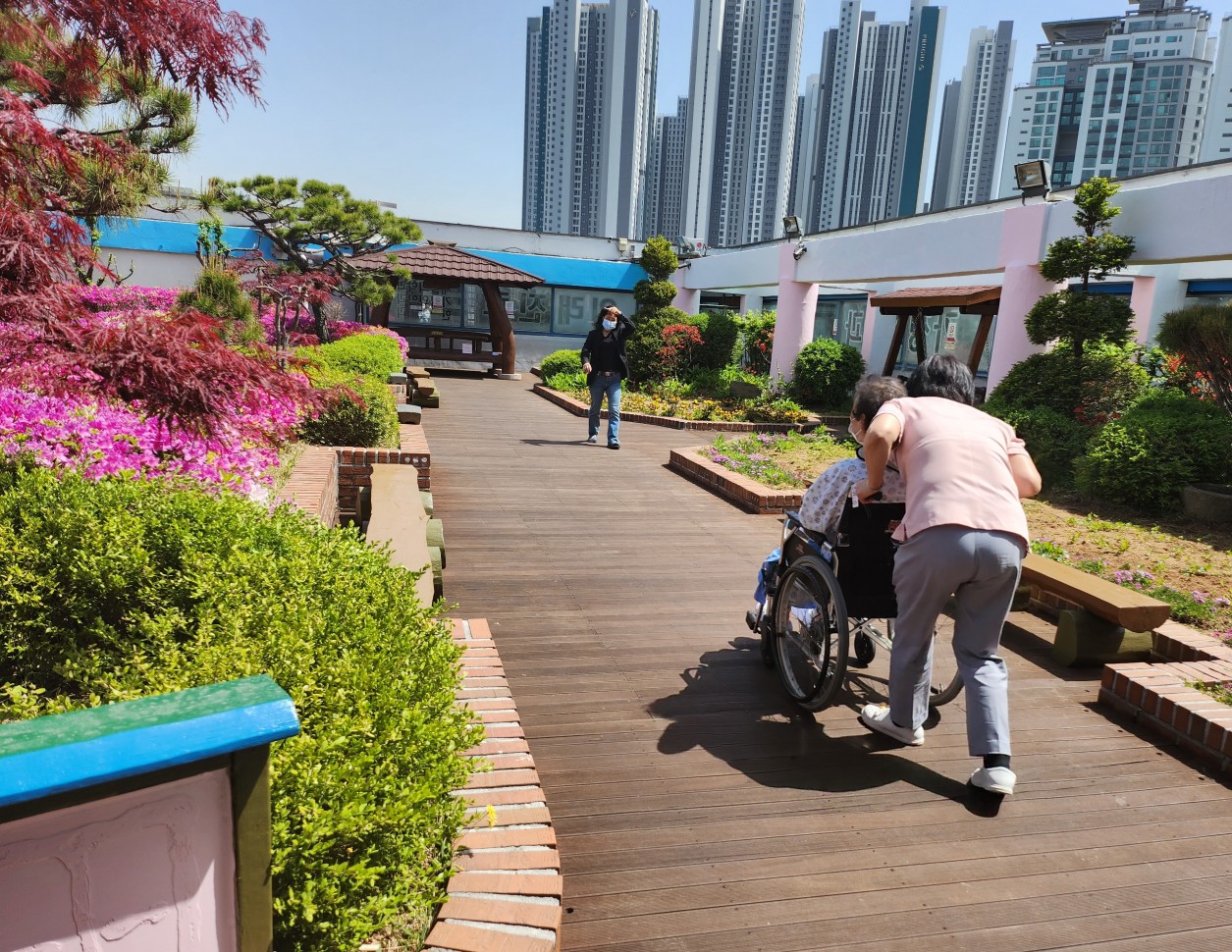 4월 따스한 봄빛에 꽃들이 활짝 피었습니다~ 햇빛 쪼이며 산책과 가족면회를 하시고 있습니다^^