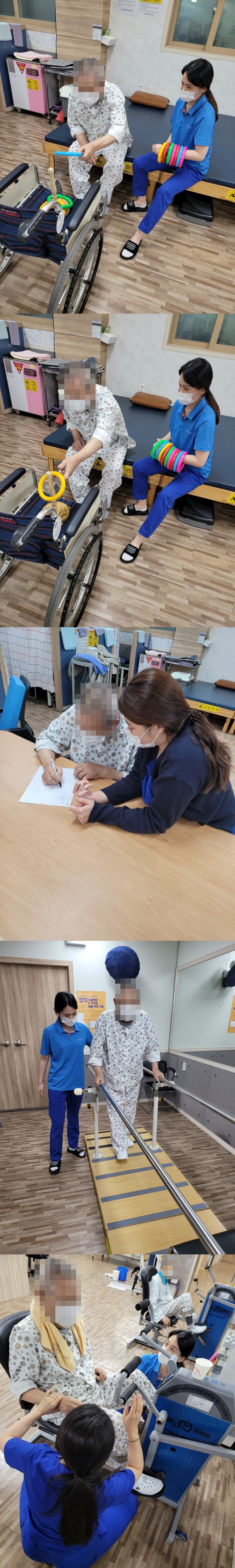 위 사진은 한분의 어르신이 중추신경계발달치료, 보행치료, 작업치료등 치료실에 내려오셔서