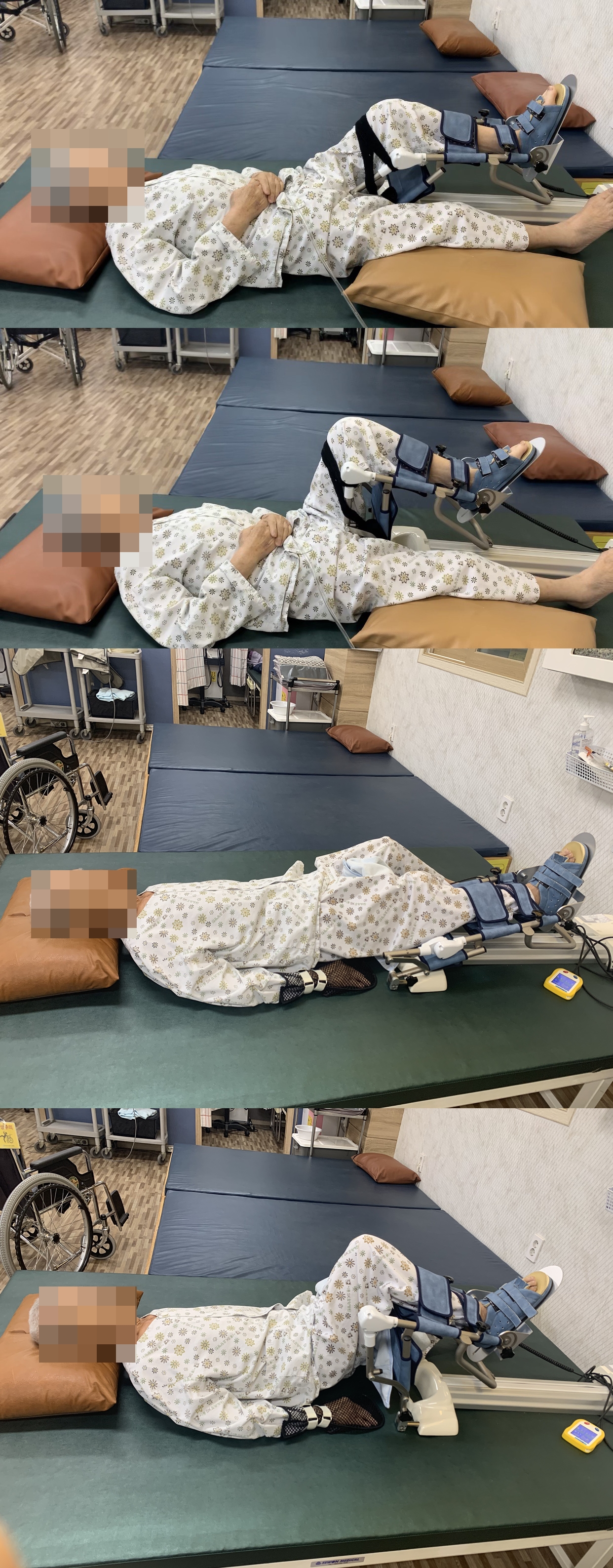 관절의 각도를 정하여 시행하며 점차 각도를 조금씩 늘리면서 점진적으로 관절가동범위가 증진될수 있도록 시행하고 있습니다.