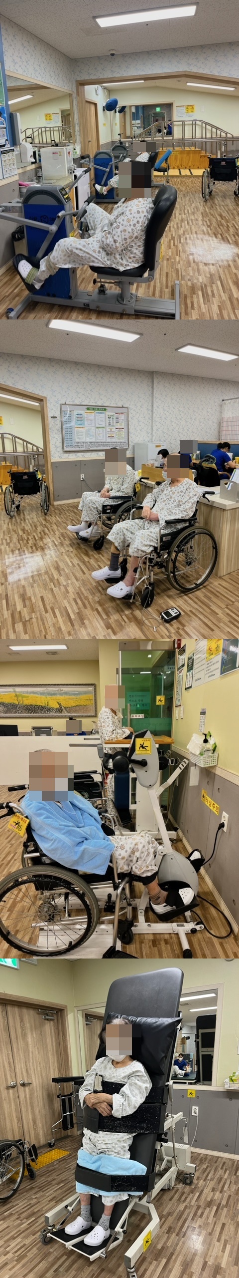 자전거, 기능적전기자극치료, 틸팅테이블 등 기구 운동을 하시는 어르신들 모습입니다.