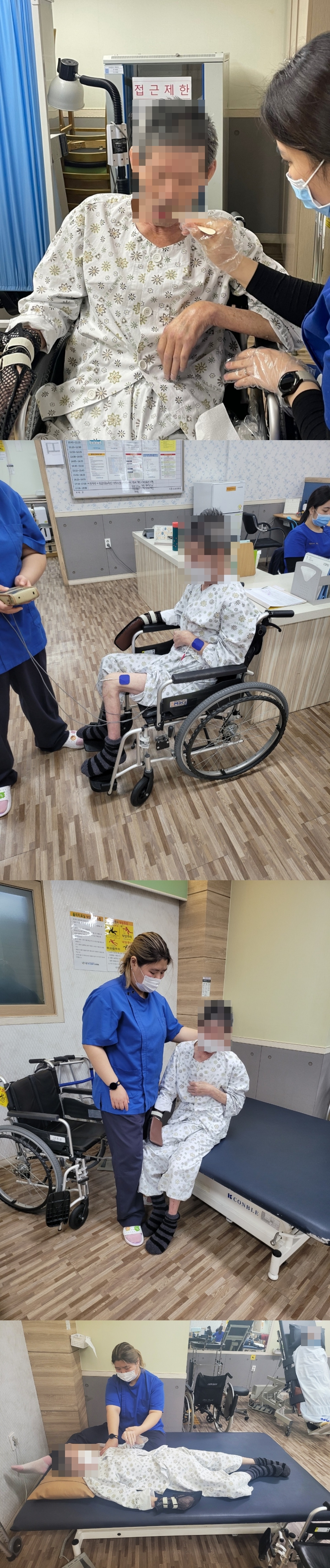 물리치료 선생님과 함께 기능적전기자극치료, 중추신경계 발달 치료 등 다양한 치료를 받고 계시는 어르신 모습입니다 :)