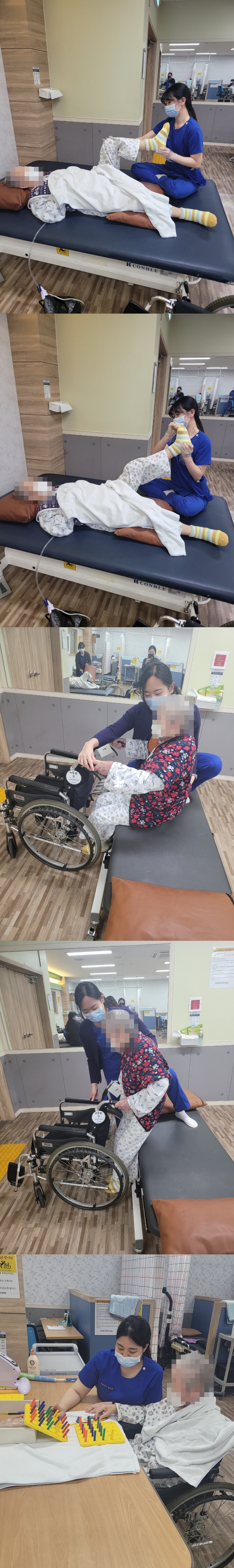 위 사진은 최**어르신이 치료실에 내려오셔서 다양한 선생님들과 다양한 치료를 받고계시는 모습인데요~