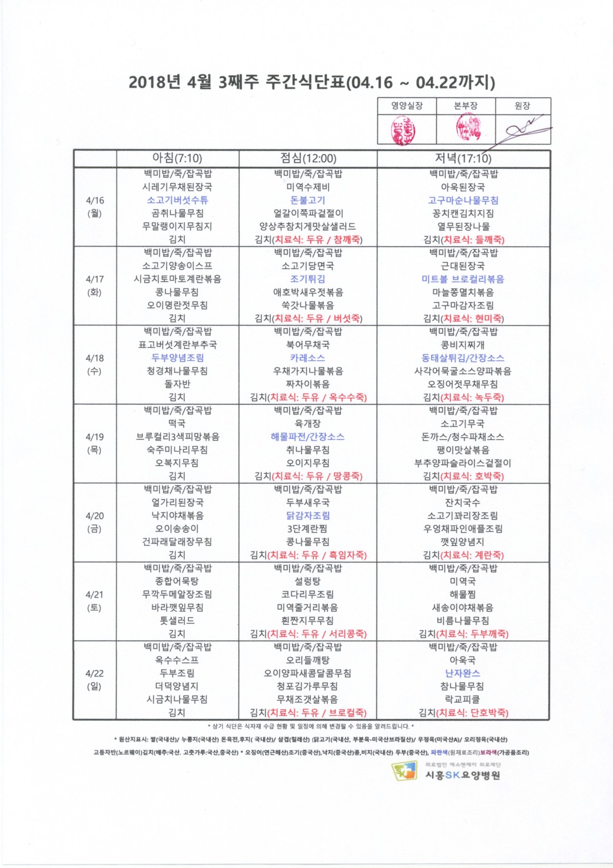 HOME > 병원소식 > 영양식단표