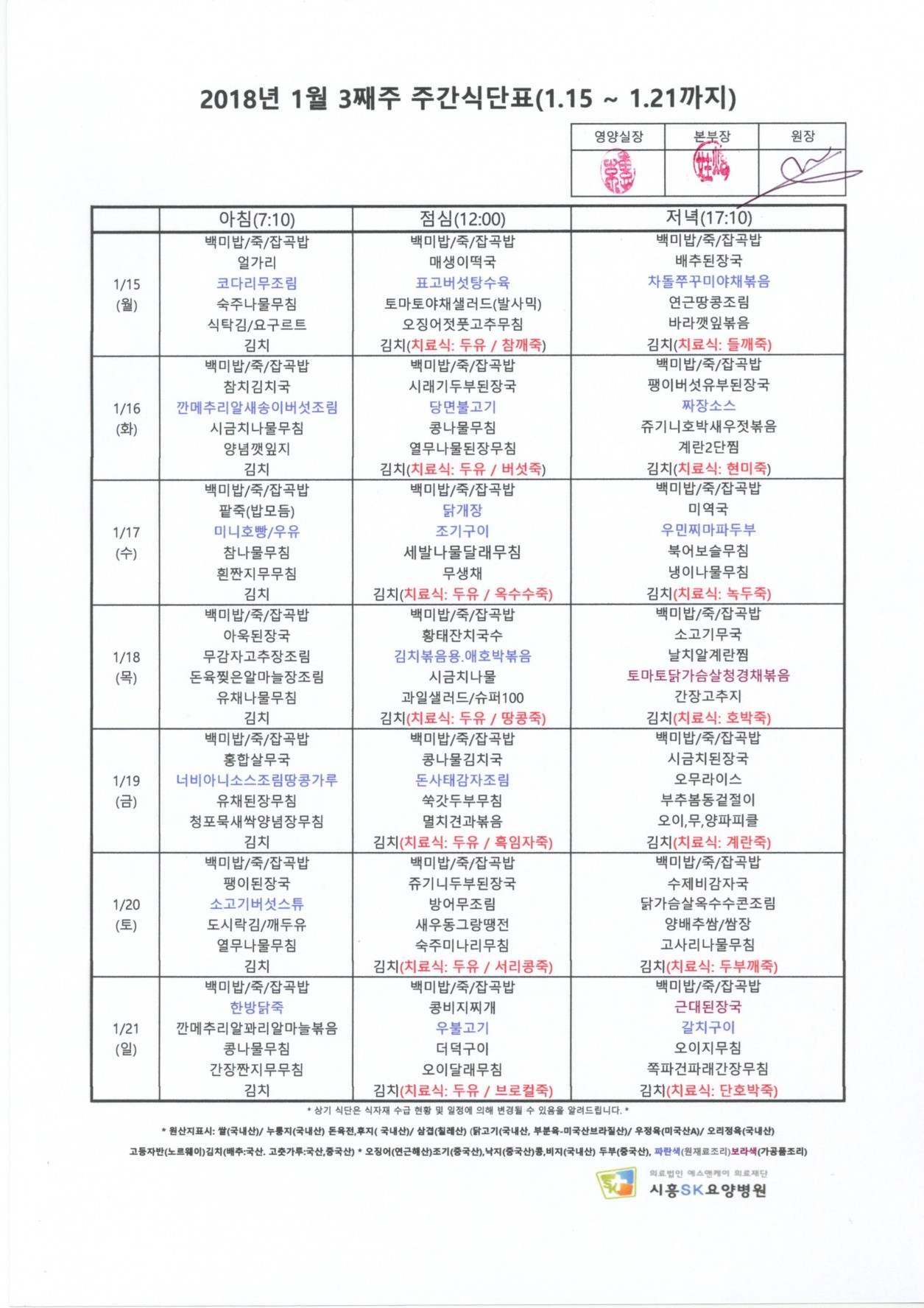 2018 년 1월 3째주 주간식단표