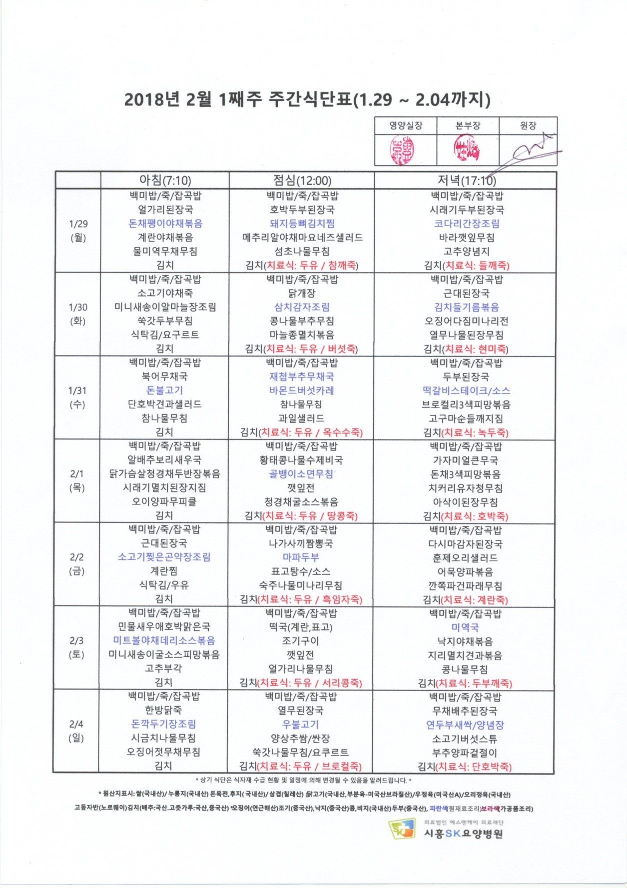 HOME > 병원소식 > 영양식단표