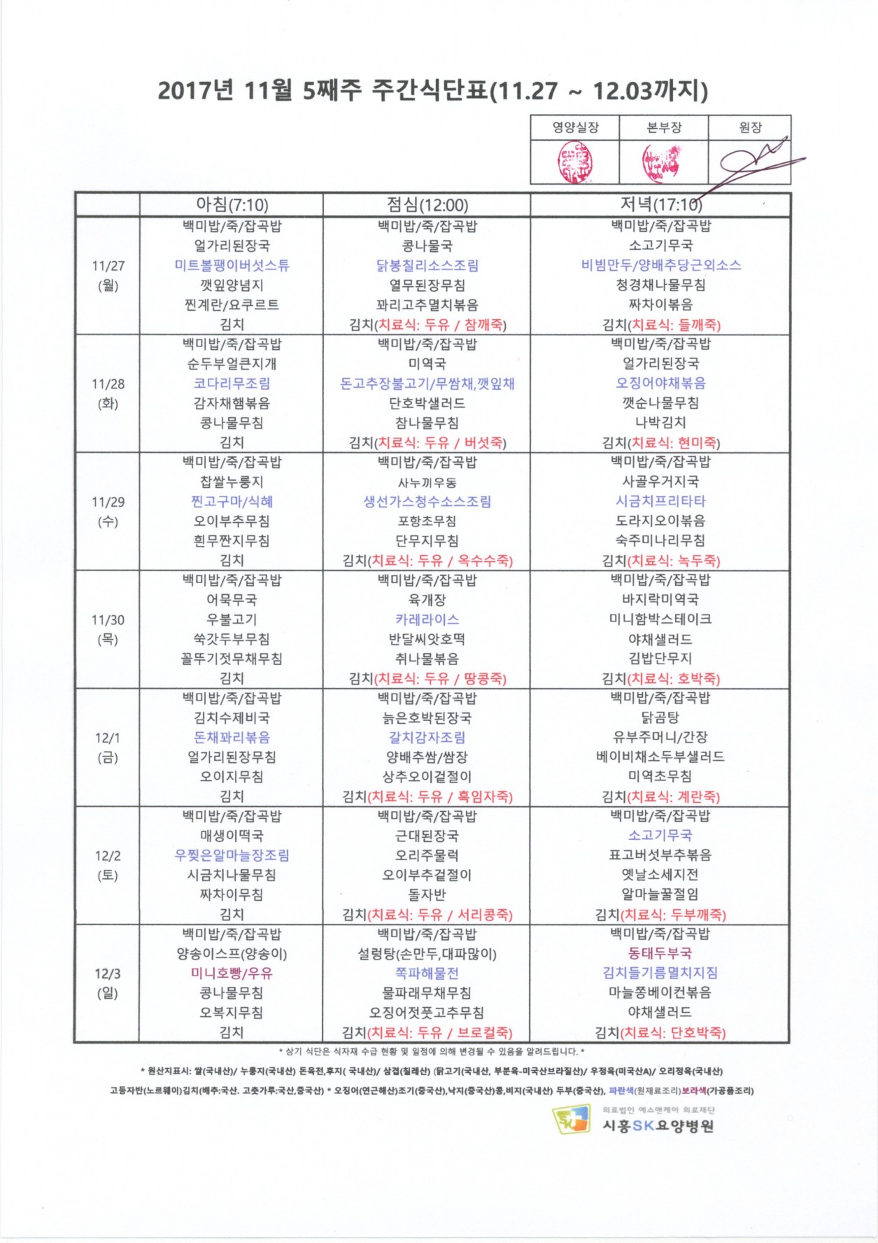 2017년 11월 5째주 주간식단표