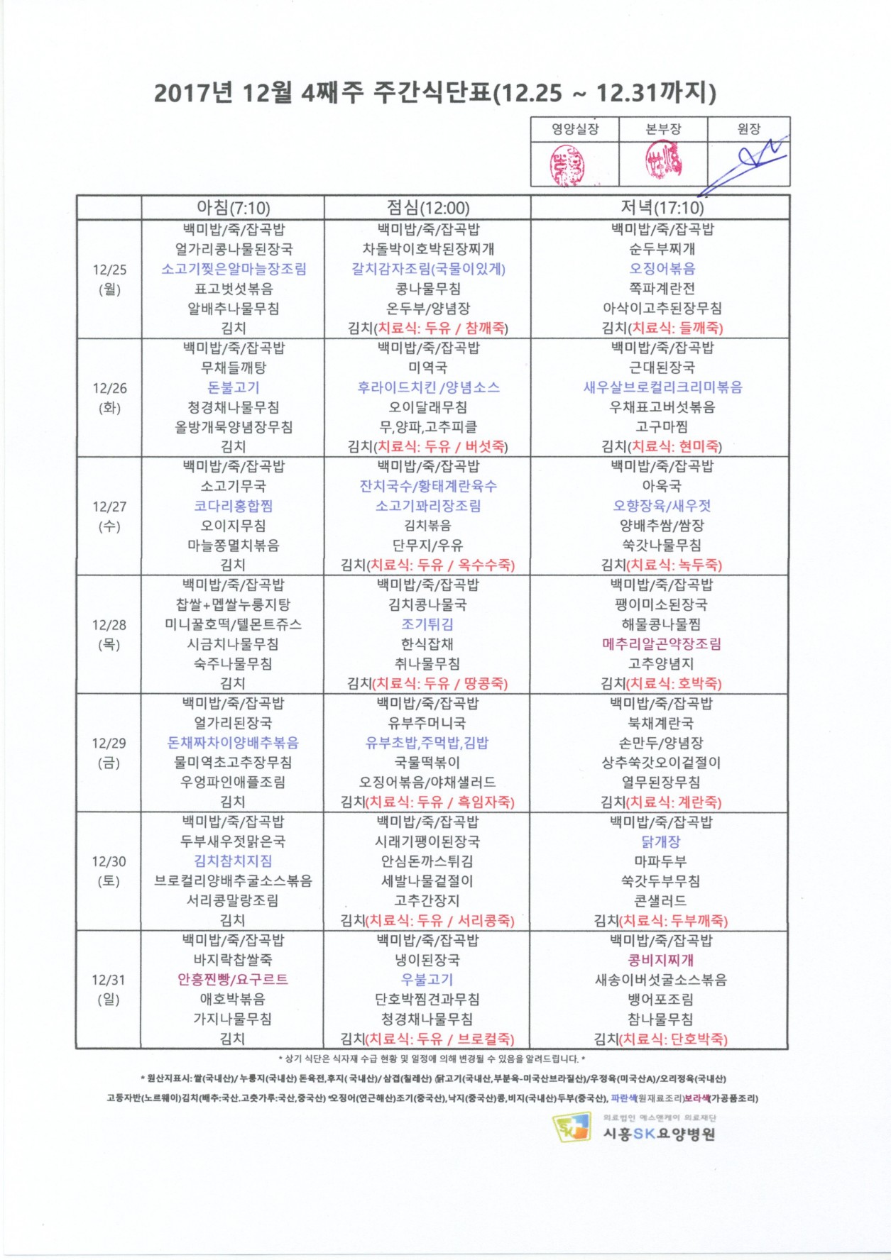 HOME > 병원소식 > 영양식단표