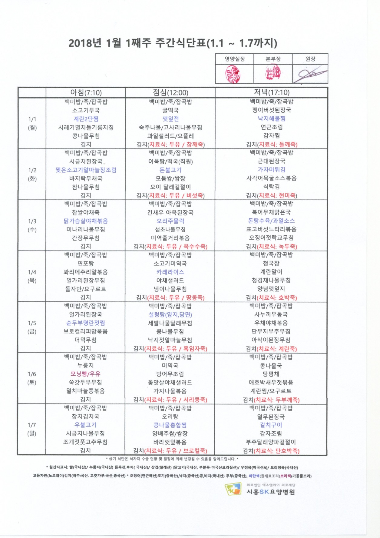2018 년 1월 1째주 주간식단표