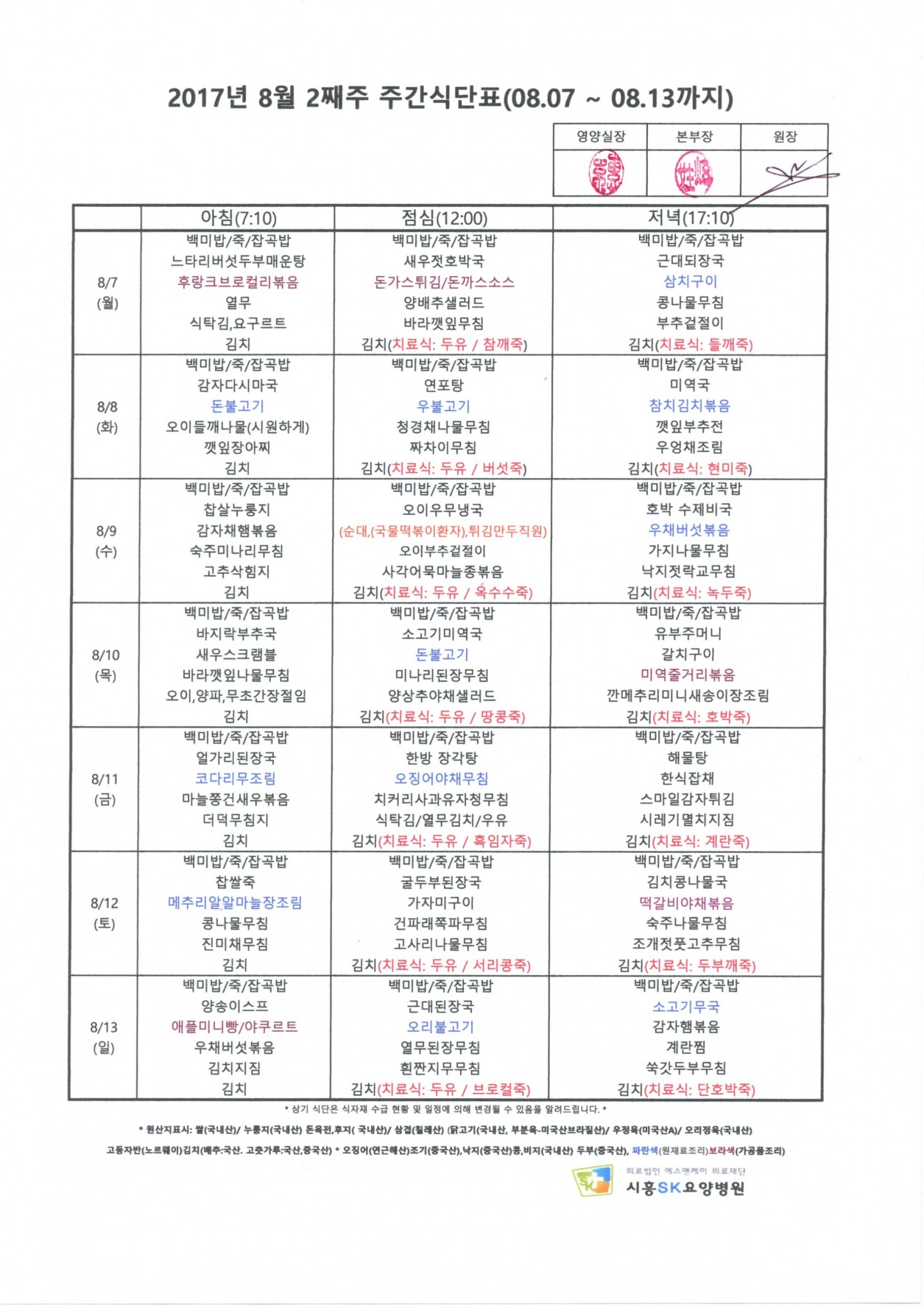 HOME > 병원소식 > 영양식단표
