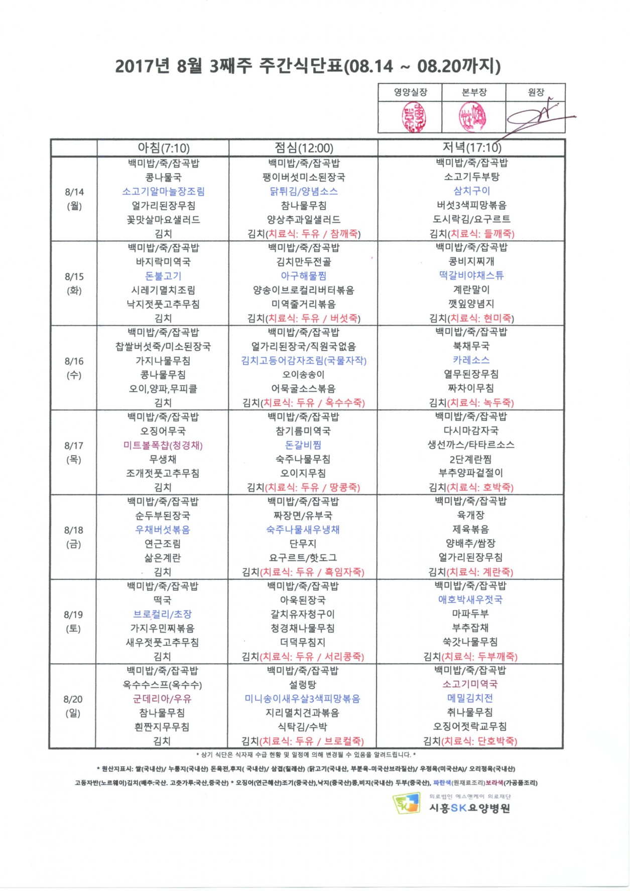 2017년 8월 3째주 주간식단표