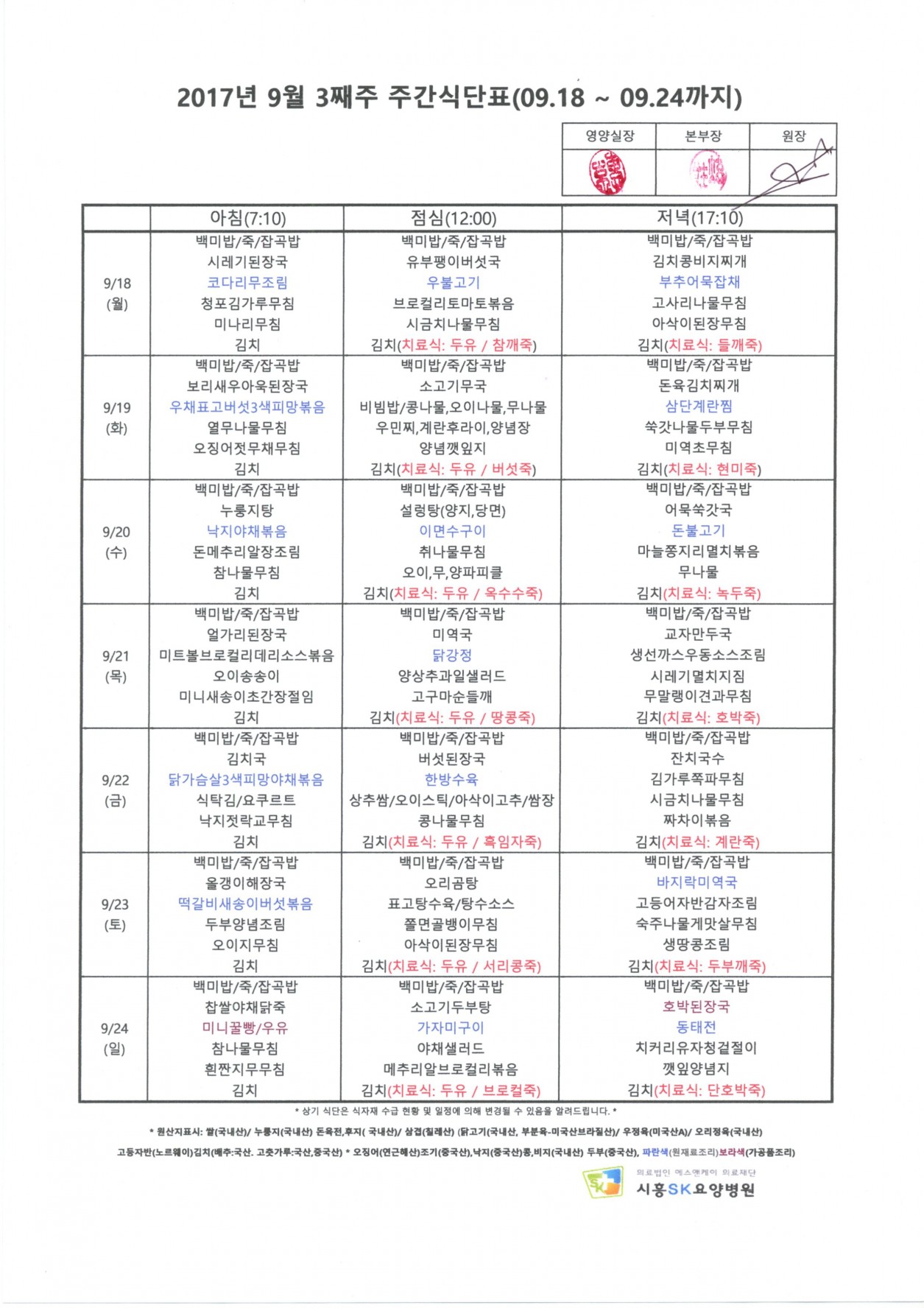 HOME > 병원소식 > 영양식단표