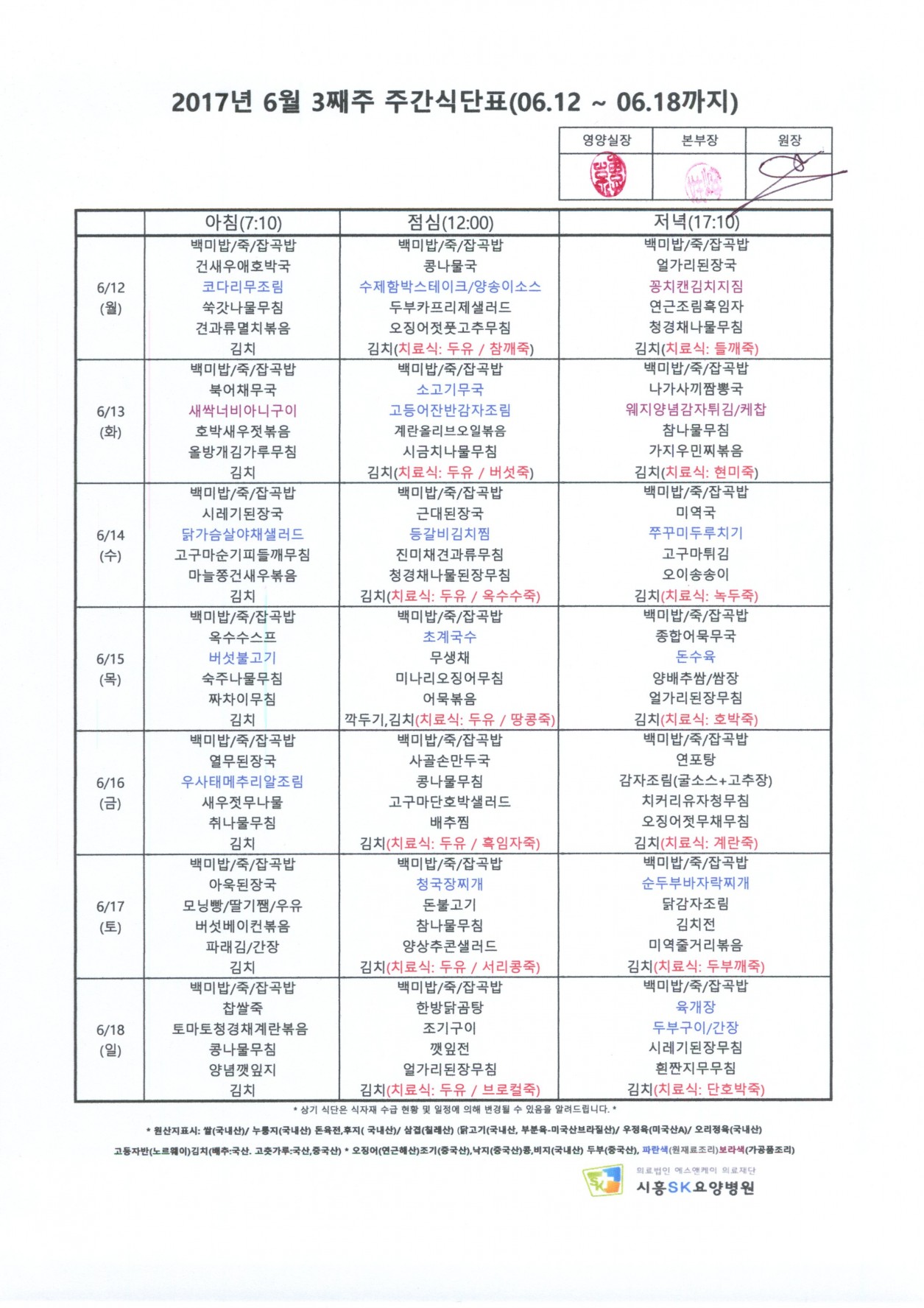 2017년 6월 3째주 주간식단표