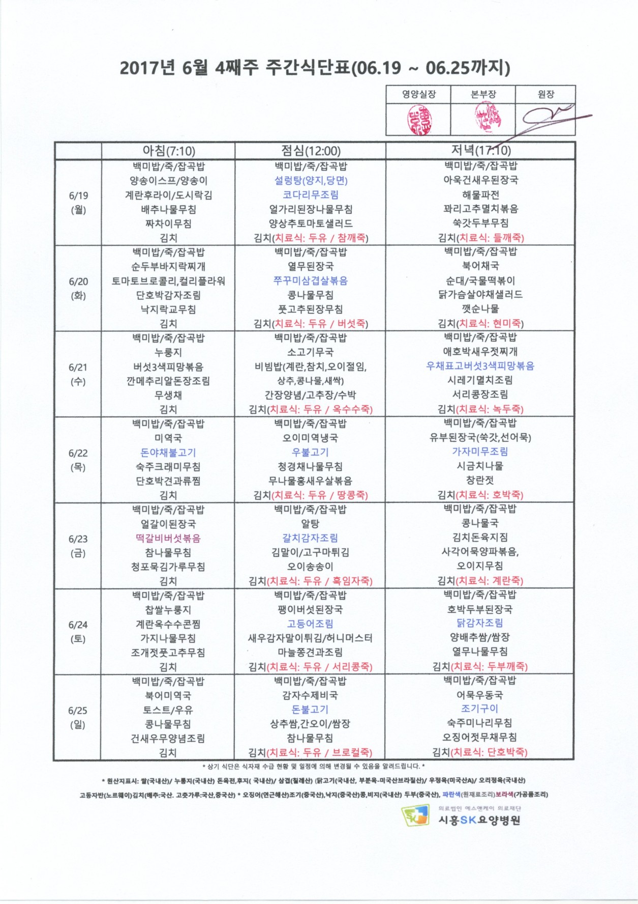 HOME > 병원소식 > 영양식단표