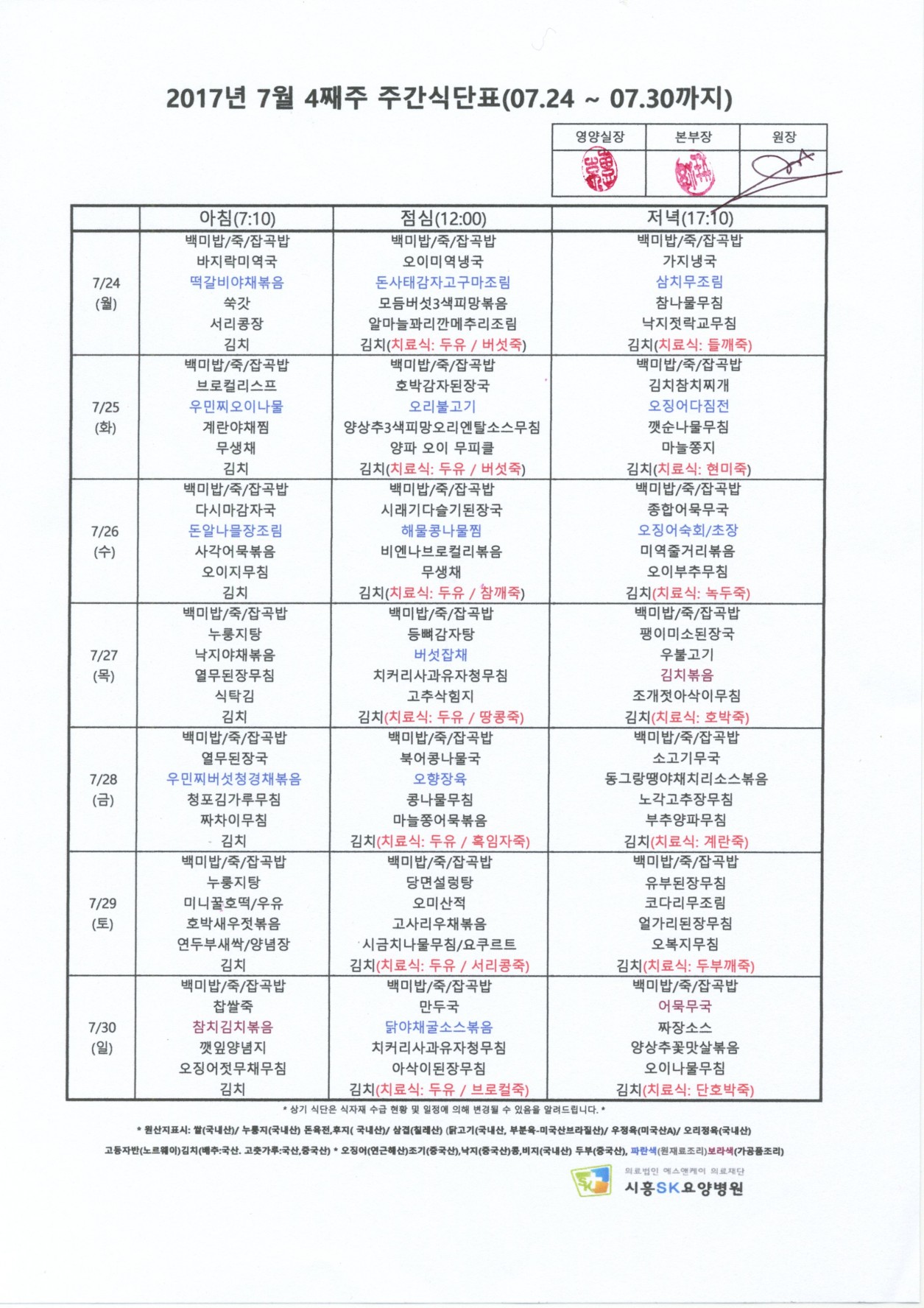 HOME > 병원소식 > 영양식단표