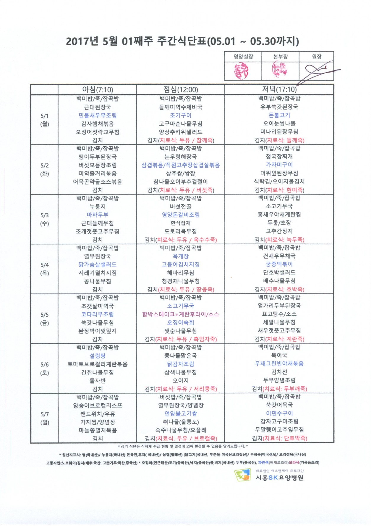 HOME > 병원소식 > 영양식단표