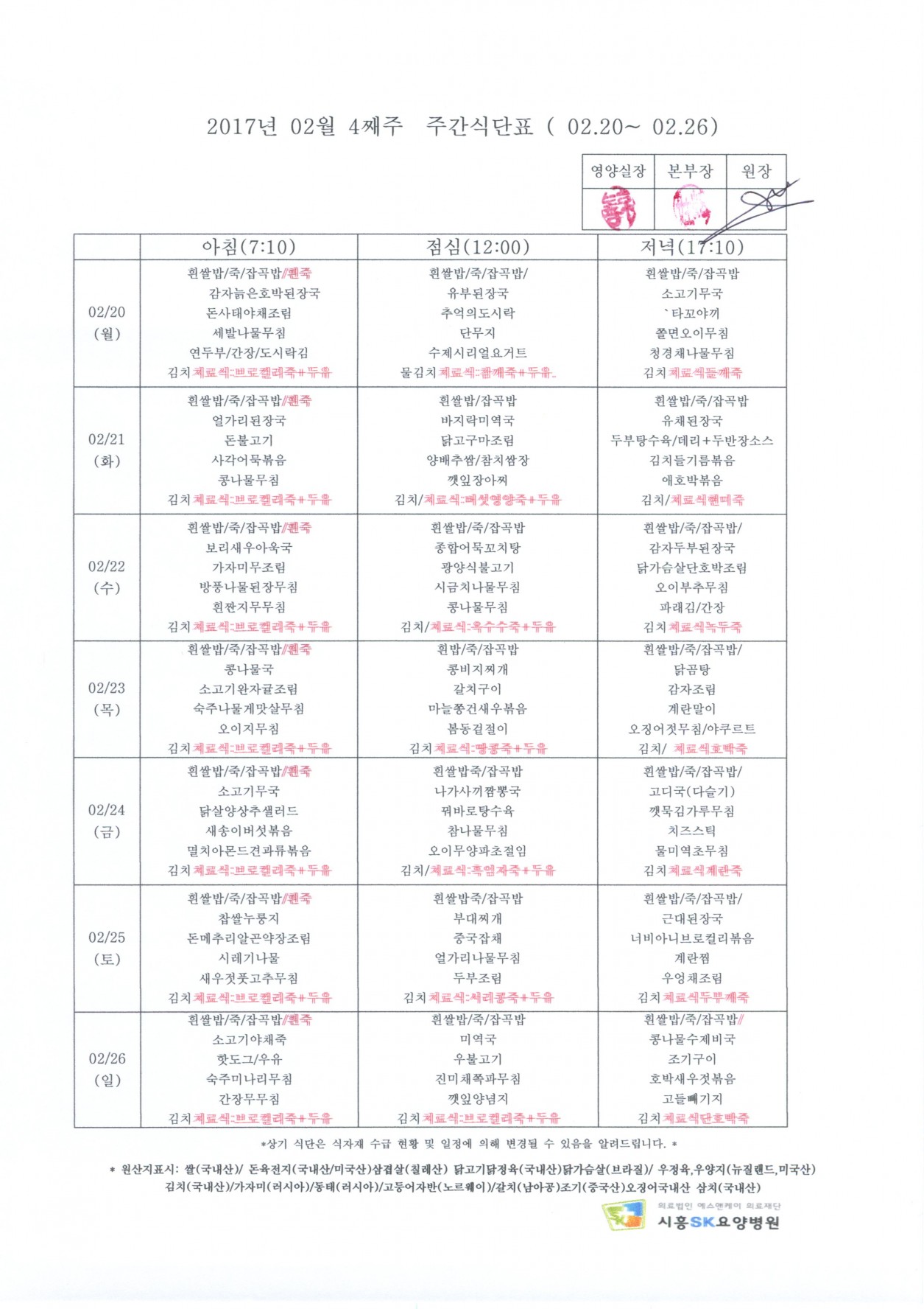 2017년 2월 4째주 주간식단표