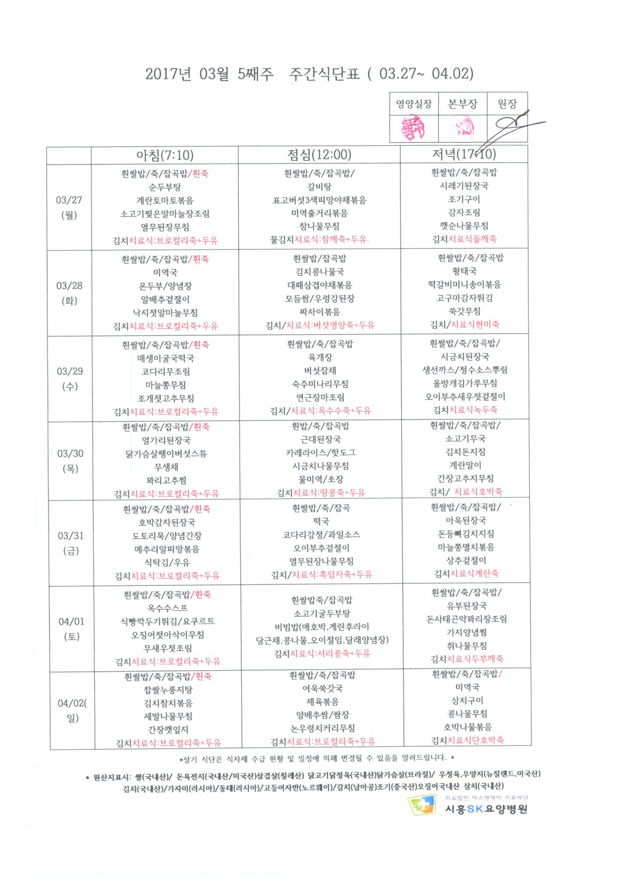 HOME > 병원소식 > 영양식단표