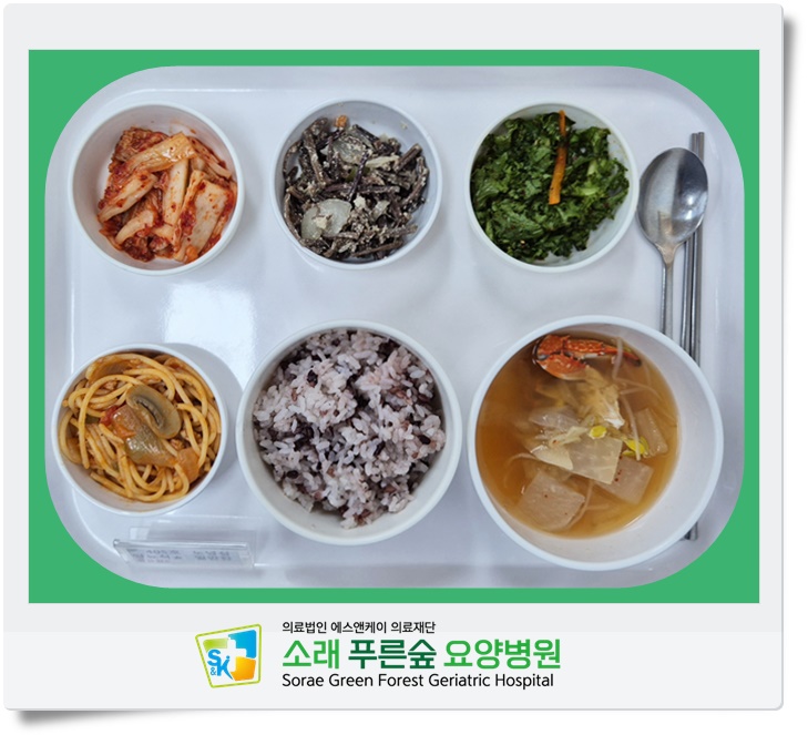 ▷ 9월 3일 중식 : 백미밥(죽/잡곡밥) / 꽃게탕 / 스파게티 / 고사리들깨볶음 / 치커리겉절이 / 김치 ◁