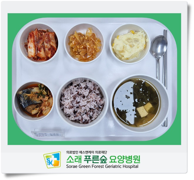 ▷ 9월 4일 중식 : 백미밥(죽/잡곡밥) / 아욱된장국 / 고등어김치조림 / 명엽채볶음 / 감자고구마범벅 / 김치 ◁