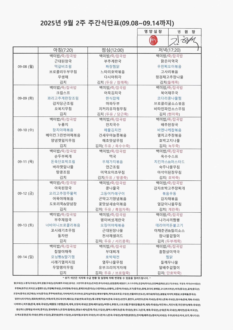 2025년 9월 2째주 주간식단표