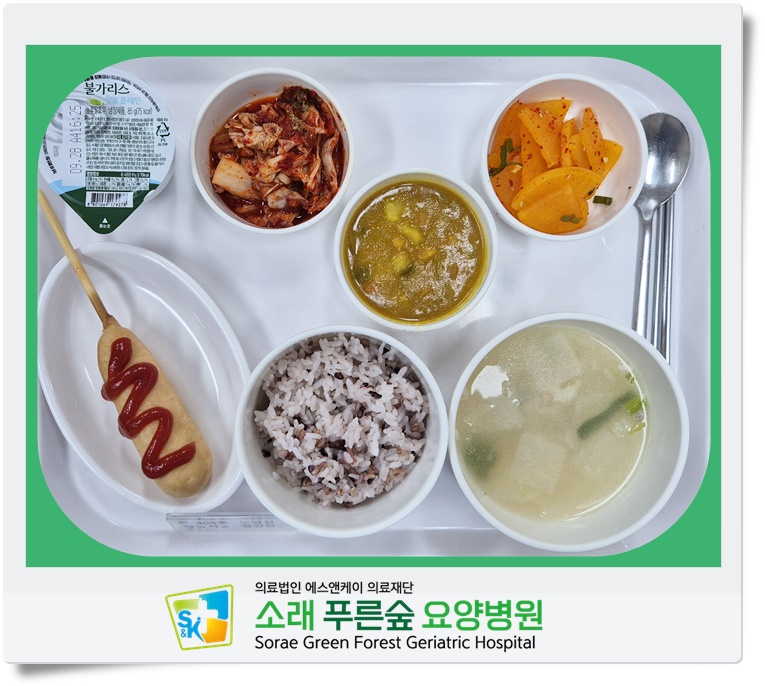 ▷ 9월 16일 중식 : 백미밥(죽/잡곡밥) / 닭곰탕 / 카레소스 / 핫도그&케첩 / 단무지무침 / 떠먹는 요플레 / 김치 ◁