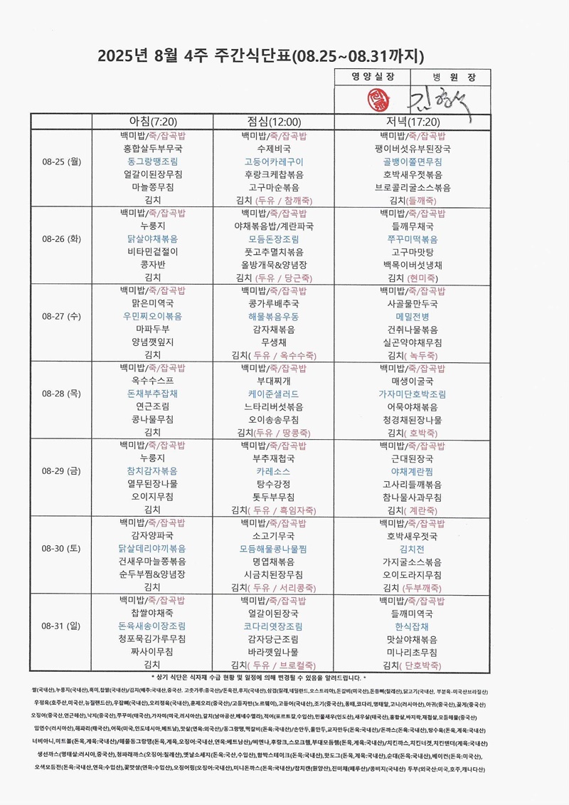 2025년 8월 4째주 주간식단표