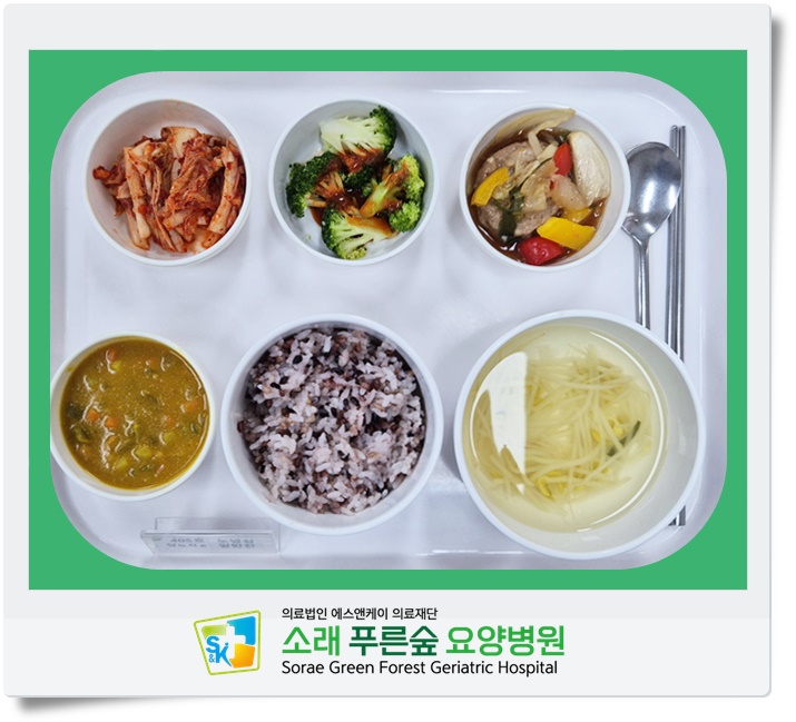 ▷ 7월 7일 중식 : 백미밥(죽/잡곡밥) / 콩나물국 / 카레소스 / 떡갈비데리야끼조림 / 브로콜리&초장 / 김치 ◁