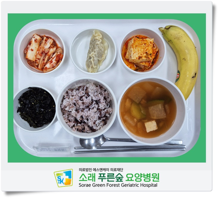 ▷ 7월 10일 중식 : 백미밥(죽/잡곡밥) / 오징어찌개 / 갈비만두 / 두부양념조림 / 돌자반 / 바나나 / 김치 ◁
